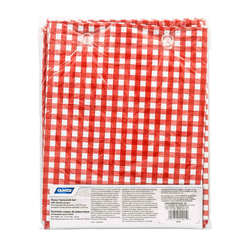 Camco's table cloth and bench covers are made of a red and white vinyl material. The tablecloth is 54"x 84" and the two bench covers are 18"x 84". They fold easily to fit in the included 9"x11" storage bag. The vinyl material construction makes them waterproof and easy to clean.
